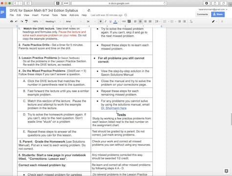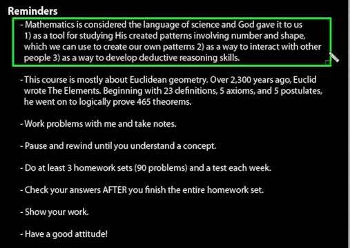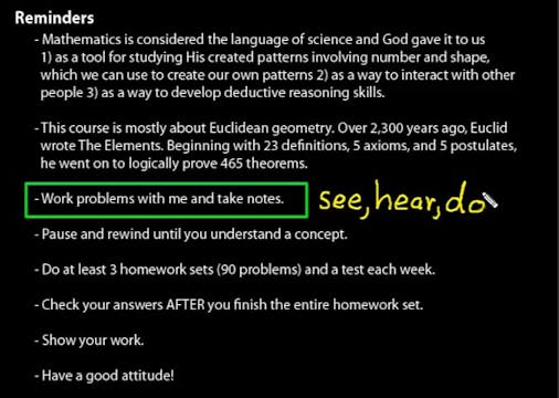 DIVE Video Lectures teach every lesson in Saxon Geometry. Dr. Shormann teaches every lesson step by step on a digital blackboard that looks and sounds like a real classroom. The only difference is, you can easily pause, rewind and fast-forward the lecture; learning at your own pace. Free sample course at diveintomath.com/samples